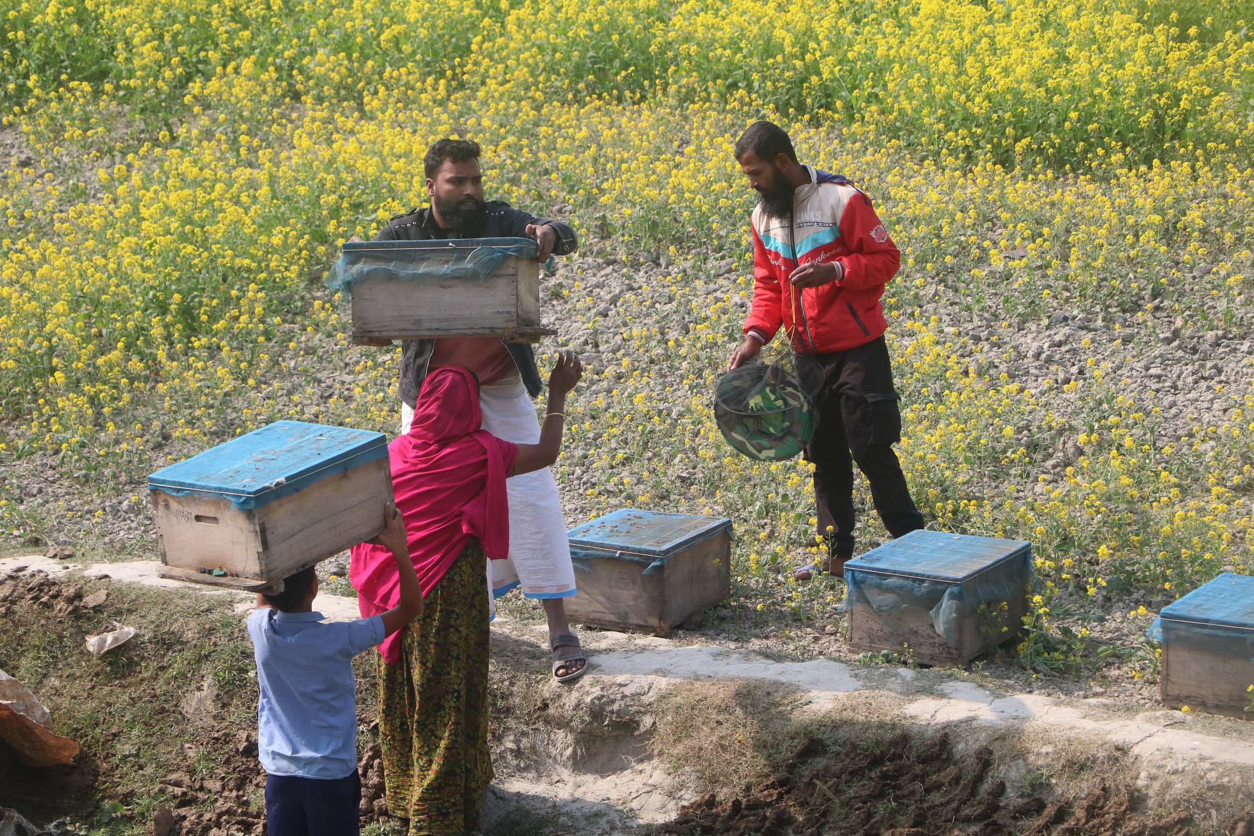 Beekeeping improves crop yields through enhanced pollination of mustard, mango, and litchi farms, creating ecological benefits alongside economic ones.
